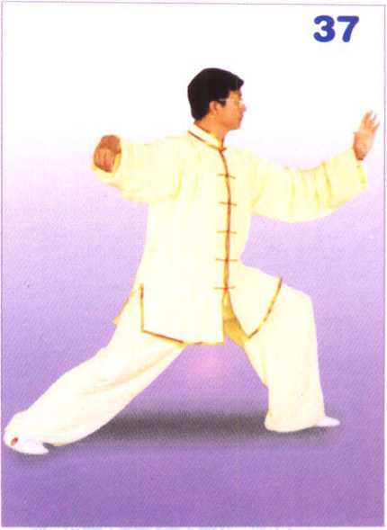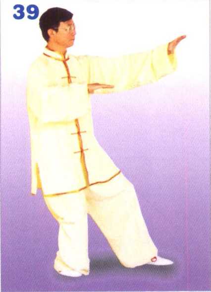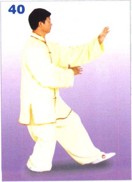 身体微向右转,重心移于右腿, 右脚全脚掌落地踏实,身体后坐, 成坐步,左脚跟微抬起;右臂屈肘 收于胸前,翻转掌心向下,掌指向 左;左掌向左而上划孤于体前,掌 心向下,掌指向前。眼随体转向前 平视。(图39)