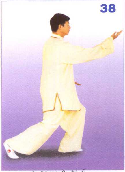 接上式,身体向左转,重心于左 腿,右脚提起向前跟半步,前脚掌落 地踏实;同时,左掌向下划弧落于左 髓侧,掌心向下,掌指向前;右勾手变 掌随体转向体前平摆,掌心向上,掌 指向前,腕与肩平。眼随体转向前平 视。(图38)