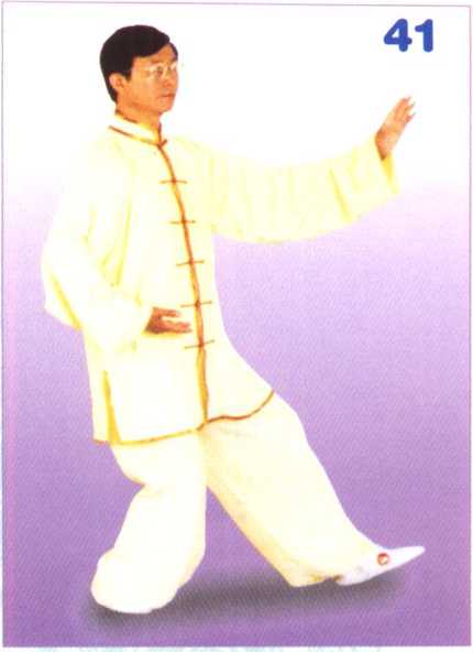 接上式,身体微向右转,重心 于右腿;右掌翻转掌心向上,向下 落于右髓侧,掌心向上,掌指向前; 同时,随体转,左掌微向前展,掌 心向前,掌指向上,腕与肩平。眼 随身体转动向前平视。(图41) 【动作要领】①身体中正,松腰沉 髓,双肩松沉,双肘下垂。②身体 转动与双掌动作同时完成。③右掌 划弧的方向应为右后45度。