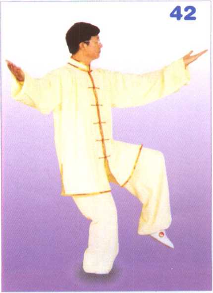 身体微向左转,重心于右腿, 左腿屈膝提起,脚尖自然下垂;右 掌向右后上方划孤与耳同高,掌心 向上,掌指向右;左掌翻转掌心向 上,掌指向前,腕与肩平。眼先视 右掌然后再视左掌。(图42) 【动作要领】①身体中正,松腰沉 髓,双肩松沉,双肘下垂。②左膝 提起,双臂平展,身体重心要平稳。 [易犯错误】左脚上提过高,身体重 心不稳。