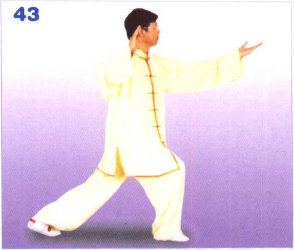 身体继续左转,重 心于右腿,左脚向后 (略偏左)退步,前脚掌 踏地;右臂屈肘,右掌 收于右耳侧,掌心向前, 掌指向上。眼随体转向 前平视。(图43) 【动作要领】①身体中正, 松腰沉髓,双肩松沉,双 肘下垂。②左脚退步时应 落在偏左位置,以避免双 脚在同一直线上。