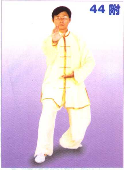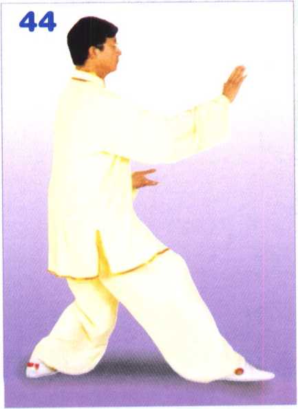 身体微向左转,重心移于左腿, 左脚跟内扣,左脚全脚掌落地踏实; 右脚以前脚掌为轴,将脚转正,全 脚掌踏实,左腿屈膝,成坐步;随 体转双掌交错,右掌在上,左掌在 下,右掌继续向前推出,掌心向前, 掌指向上,腕与肩平;左掌向下落 收于腹前,掌心向上,掌指侧向右。 眼视右掌方向。(图44)