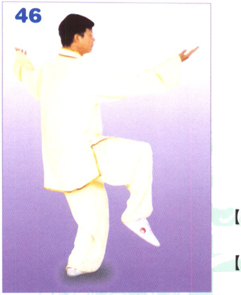 身体微向左转,重心于左腿, 右腿屈膝提起,脚尖自然下垂;左 掌向左后上方划弧与耳同高,掌心 向上,掌指向左;右掌翻转掌心向 上,掌指向前,腕与肩平。眼先视 左掌然后再视右掌。(图46) 【动作要领】①身体中正,松腰沉 髓,双肩松沉,双肘下垂。②右膝 提起,双臂平展,身体重心要平稳。