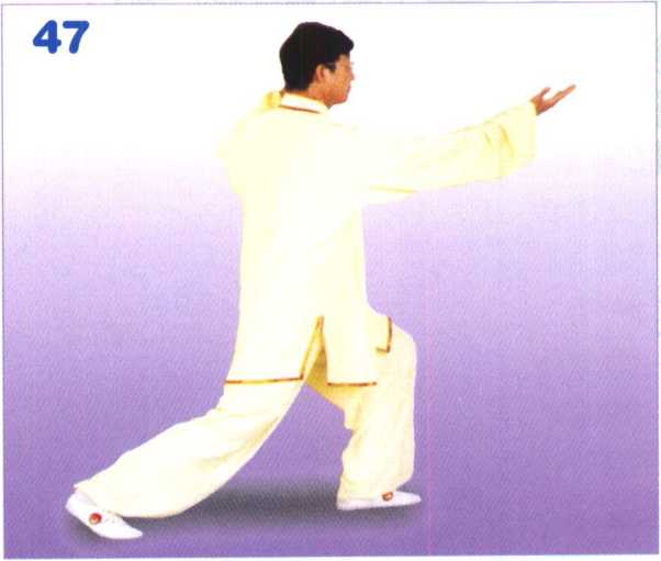 1 身体微向右转,重心移于右腿,右 脚跟内扣,右脚全脚掌落地踏实;左脚 以前脚掌为轴,将脚转正,全脚掌踏 实,右腿屈膝,成坐步;随体转双掌交 错,左掌在上,右掌在下,左掌继续向 前推出,掌心向前,掌指向上,腕与肩 平;右掌向下落收于腹前,掌心向上, 掌指侧向左。眼视左掌方向。(图48) 【动作要领】①身体中正,松腰沉髓, 双肩松沉,双肘下垂。②右脚跟向内 拧转,再落地踏实,与正前方成45 度。③双掌动作与转体、左脚转正, 同时协调完成。