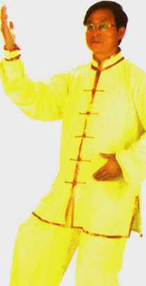 身体左转,重心于左腿,左 手落于左髓侧,手心向内。
