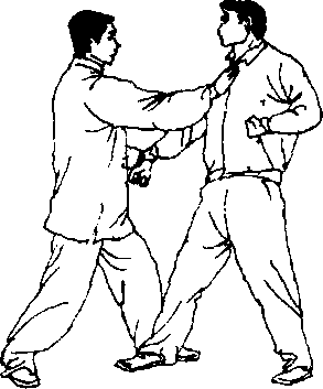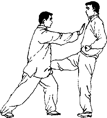 例1:甲方用右脚蹬乙裆部或腹部(图280)。 乙方迅速用左手搂挡甲方右腿,然后左脚向前上步 (图281),重心前移成左弓步,右掌向甲方胸部推击 (图 282) o
