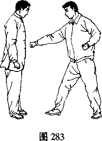 例2:甲方左脚向前上步,用右拳向乙方腹部 冲击(图283)。乙方迅速用左手向外搂挡甲方右拳, 然后左脚向甲方右脚外侧上步,重心前移成左弓步, 右掌向甲方胸部推击(图284)。