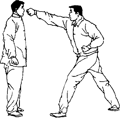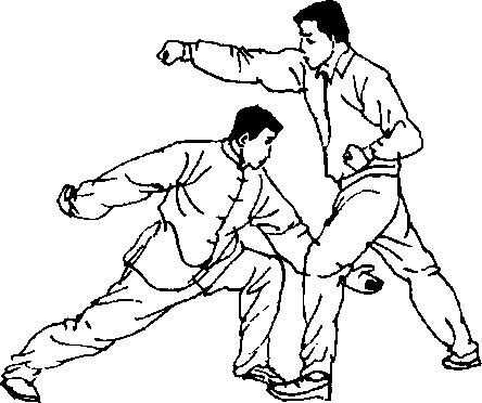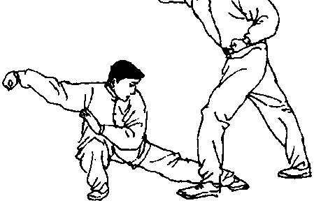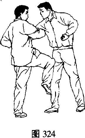甲方左脚向前上步,用右拳向乙方面部冲击 (图319)。乙方迅速下蹲成仆步,躲开甲方来拳(图 320),然后右腿蹬直,左腿前弓,左掌迅速向甲方 裆部挑击(图321),使其裆步受损。