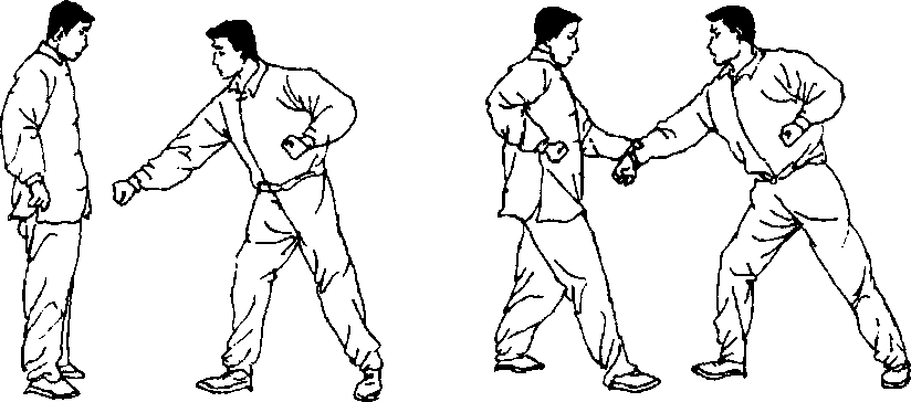 甲方右脚向前上步,用右拳向乙方胸、腹部冲 击(图322)。乙方左脚迅速向后退步,用左手抓握 甲方右腕部(图323),然后顺甲方前冲之力,用力 向后牵拉甲右臂,当甲方被牵拉而重心前倾时,乙 方迅速提起右腿,用膝盖顶甲胸、腹部,同时右掌 迅速向甲方右腋下挑打(图324)。此时,乙方左掌 也可上托甲方下颌部(图325),使甲方多处受伤。