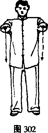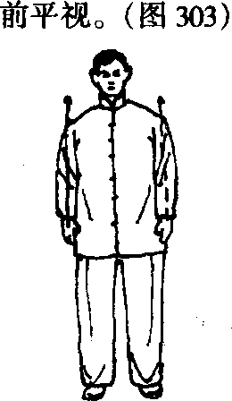 (2)两臂前举:两手臂慢慢向前上方平举,两掌高与肩 平,同肩宽,掌心向下,肘微下垂;眼看两掌方向。(图 302)
