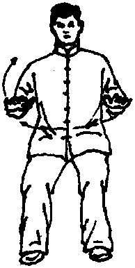 时,两掌轻轻下按,掌心向下,两肘下垂,与膝相对;眼向