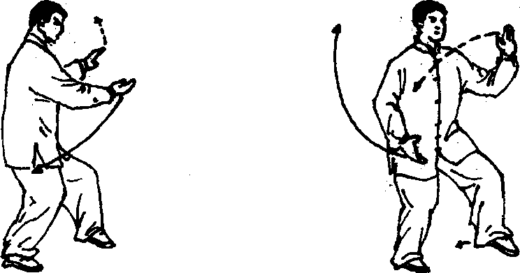 L右手从体前下落,右下向后上方划孤至右肩外,手 与耳同高,掌心斜向上;左手由左下向上、向右划弧至右胸 前,掌心斜向下;同时上体先微向左再向右转;左脚收至右 脚内侧,脚尖点地,眼看右手。(图414、415、416)
