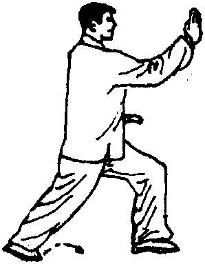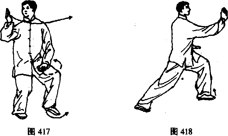 右手屈回由耳侧向前推出,高于鼻尖平,左手向下由左膝前 搂过落于左胯旁,指尖向前;眼看右手手指° (图417、418)
