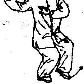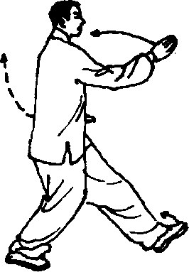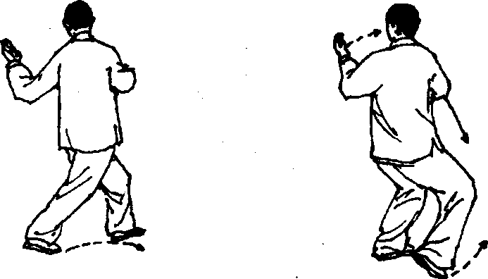 3 .右腿慢慢屈膝,上体后坐,身体重心移至右腿,左 脚尖翘起微向外撇,随后脚掌慢慢踏实,左脚前弓,身体左 转;身体重心移至左腿,右脚收至左脚内侧,脚尖点地;同