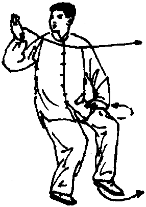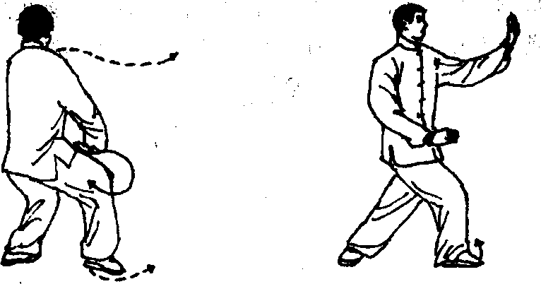 随若手向下、向右划弧,左脚收回并向翦迈出时;均匀 吸气,左脚跟着地,吸气止,此时意识引导总腰松垮,意气 注入左手合于胸前;当重心前移,成左弓步搂推时,改为呼 气,意识则引导命门前顶,使重心前移,劲力由右腰、右 肩、右手向前推出。再身体后坐,均匀吸气,意气注入丹 田,使身体保持中正;当身体左转,左手向左后方划弧,右 脚收脚时,改为呼气,意识引导命门前顶将脚提起,而不是 蹬地收脚。随右脚向前迈出,左手收至左耳侧,右手向下划 弧时,均匀吸气,右脚跟着地吸气止,意识随右脚的迈出引 导右手向下划弧,使身体保持中正平稳;当重心前移,成右 弓步搂推时,改为呼气,意识引导劲力由左腰、左肩、左手 向前推出。右转体收脚、左弓步搂推的意气配合与前面的完 全相同。此动作完成5吸5呼的呼吸转换。