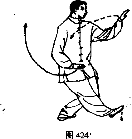 时左手向外翻掌由左后向上划弧至左肩外侧,肘微屈,手与 耳同高,掌心斜向上;右手随转体向上、向左下划典落于左 胸前,簟心斜向下;眼看左手。(图419、420、421?