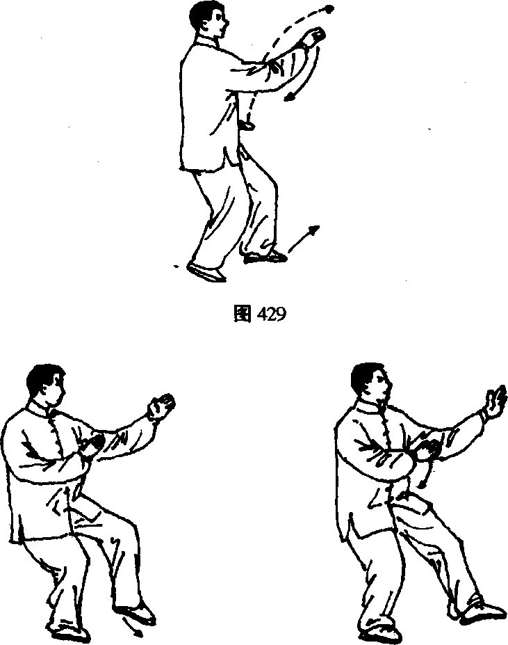 右脚跟进半步,上体后坐,身体重心转至右腿上,上体 半面向右转,左脚略提起稍向前移,变成左虚步,脚跟着 地,脚尖翘起,膝部微屈;同时左手由左下向上挑举,高于 鼻尖平,掌心向右,臂微屈;右手收回放在左肘里侧,掌心 向左;眼看左手食指。(图429、430、431)