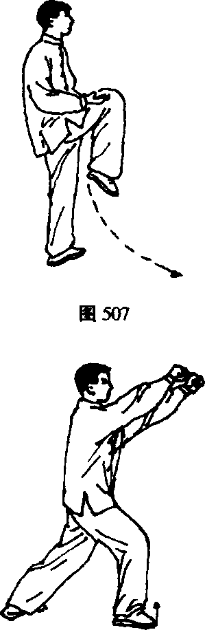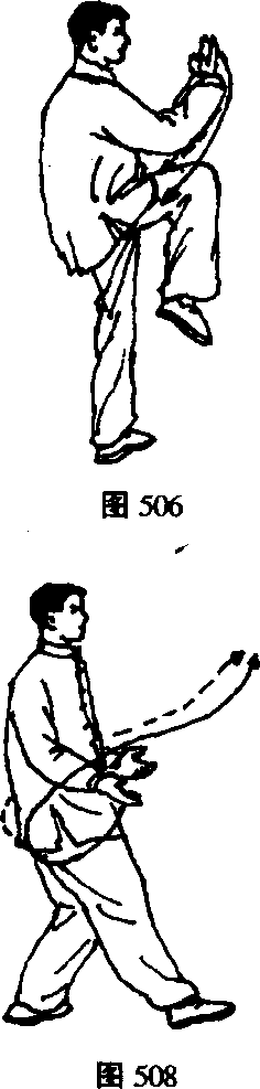 L右腿收回,屈膝平举,左手由后向上、向前下落至 体前,两掌心均翻转向上,两掌同时向下划弧分落于右膝两 侧;眼看前方。(图506、507)