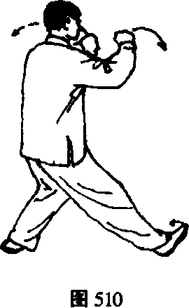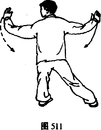 1 .左腿屈膝后坐,身体重心移至左腿,上体左转,右 脚尖里扣;同时两拳变掌,由上向左右划弧分开平举,掌心 向前;眼看左手。(图510、511)