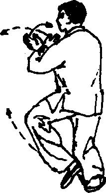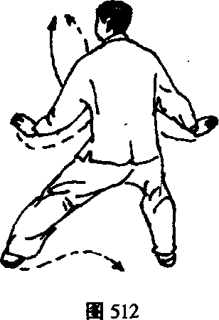2 .身体重心再移至右腿,左脚收到右脚内侧,脚尖点 地;同时两掌由外圈向里圈划弧合抱于胸前,左手在外,掌 心均向后;眼平看左方。(图512、513)