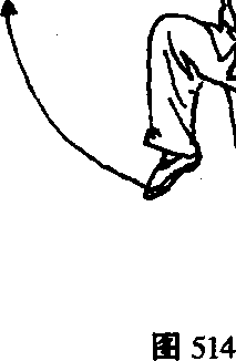 3 .两臂左右划弧分开平举,肘部微屈,掌心均向外; 同时左腿屈膝提起,左脚向左前方慢慢蹬出;眼看左手。 (图 514、515)