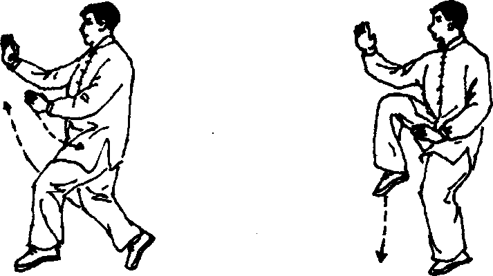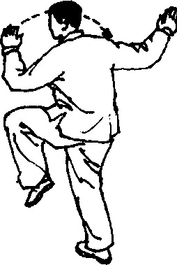 4 .右腿慢慢提起平屈,成左独立势;同时右手变掌, 并由后下方顺右腿外侧向前弧行摆出,屈臂立于右腿上方,