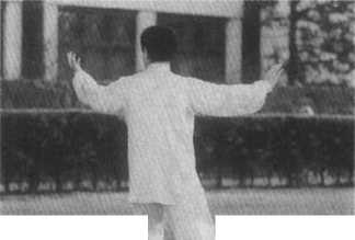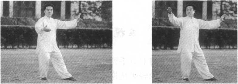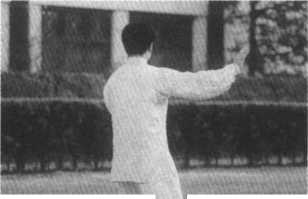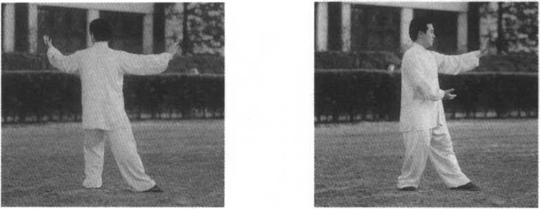 (1)转体撤手:上体微向左转,同时左手随转体向后上方划 弧平举,手心仍向上,右手随即翻掌,手心逐渐向上;眼随转体 先向左看,再转向前方看右手(见图4-52、4-53)。