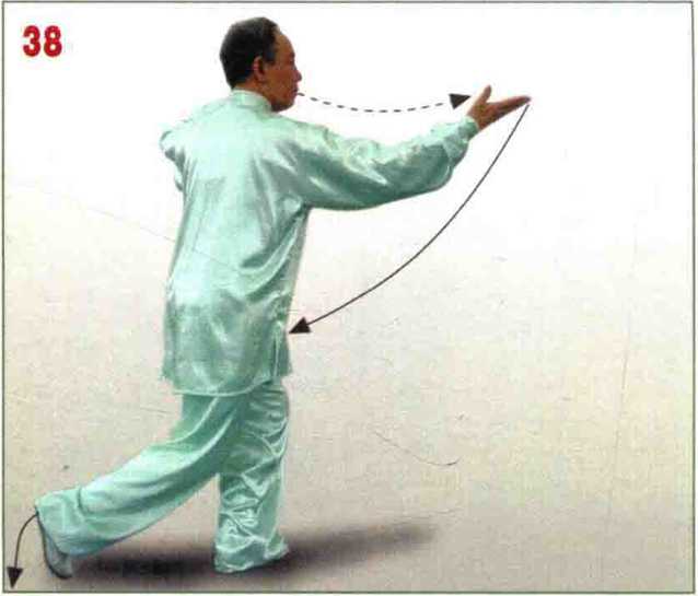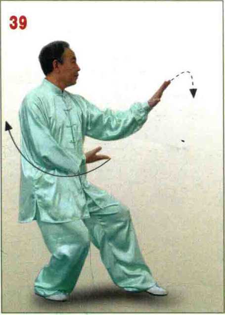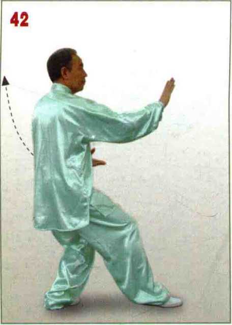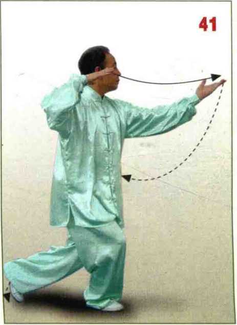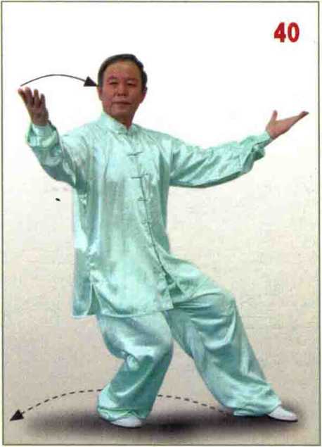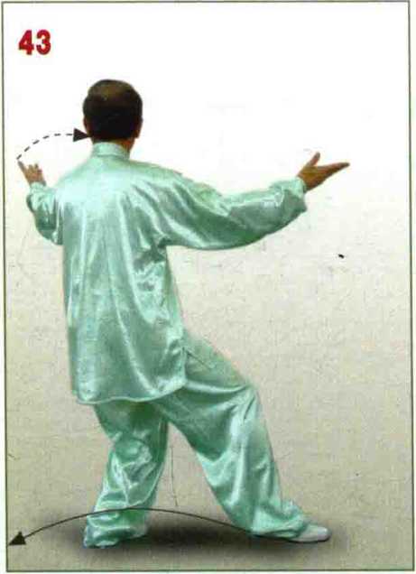 脚前掌轻 轻落地;左臂屈卷,左手 收至肩上耳侧,掌心斜向 前下方;右手开始后收; 眼看右手。