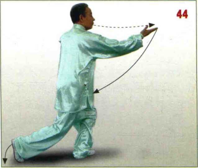 上体继续右转;重心后移,右脚 踏实,左脚以脚掌为轴扭直,脚跟离 地,左腿微屈成左虚步;左手推至体 前,腕与肩同高,掌心向前;右手向 后、向下划弧,收至右腰侧;眼看左 手。