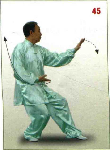 上体稍右转;右脚提 收向后退一步,脚前掌轻 轻落地;左臂屈卷,左至 收至肩上耳侧1,掌心斜向 前下方;右手开始后收; 眼看右手。