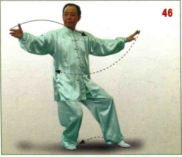 上体微右转;右手 由腰侧向右上方划弧, 右臂微屈,手与肩同高, 掌心斜向上;左手在体 前放松,手心向下;头随 身体转动,眼向右平视。