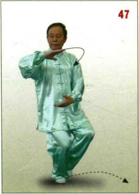 上体右转;两手同时 向下经腹前向右后方划 弧后捋,右手举于身体侧 后方,与头同高,掌心向 外;左臂平屈于胸前,掌 心向内;重心后移,身体 后坐,右腿屈膝,左腿自 然伸直;眼看右手。