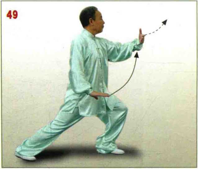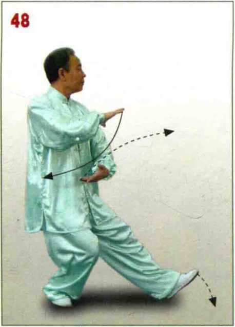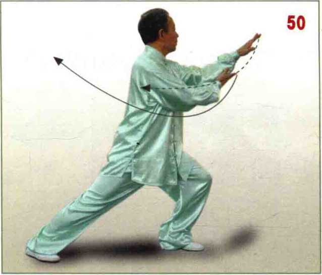 上体继续左转;重 心前移,左脚踏实,左腿 屈膝前弓,右腿自然蹬 直,成左弓步;两手前后 分开,左臂半屈向体前 搠,腕与肩同高,掌心向 内;右手向下划弧按于 右胯旁,掌心向下,五指 向前;眼看左手。