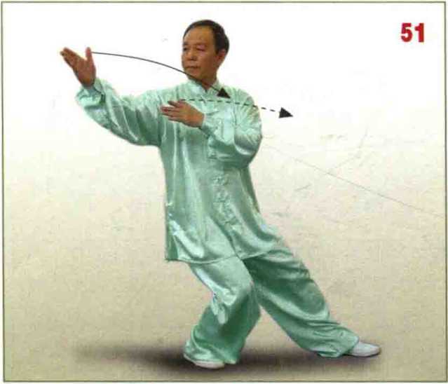 上体稍左转;左手向 左前方伸出,掌心转向 下;同时右臂外旋,右手 经腹前向上、向前伸至左 前臂内侧,掌心向上;眼 看左手。