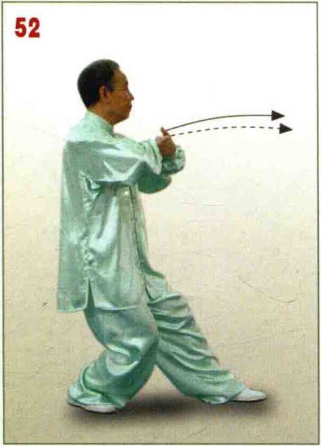 重心前移,左腿屈弓,右腿自然 蹬直成左弓步;右手推送左前臂向 体前挤出,与肩同高,两臂撑圆;眼 看刖方。