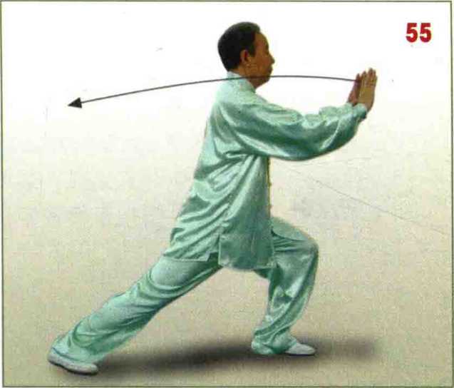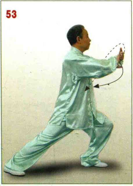 重心后移,上体后坐,右腿屈 膝,左腿自然伸直,左脚尖翘起;左 手翻转向下;右手经左腕上方向前 伸出,掌心也转向下。两手左右分开 与肩同宽,两臂屈收,两手后引,经 胸前收到腹前,手心斜向下;眼向前 平视。