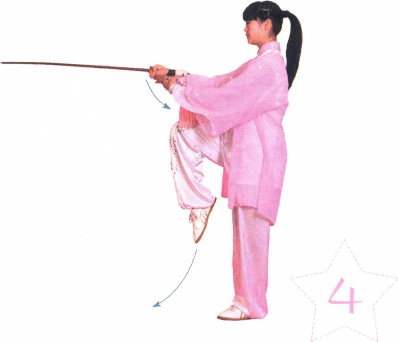 右腿屈膝向前提起,成左独立步。右手持剑翻转向体前划弧摆送。 左剑指变掌捧托在右手背下面。两臂微屈,两手合在胸前,手心向上,剑 身直向前方,剑尖略高。眼看前方。(图13-4)