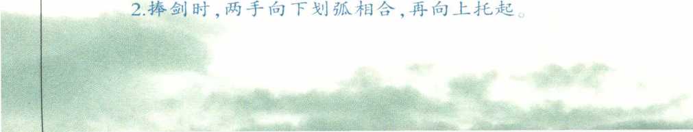 1 .两手路线要走弧形,即先微向外,苒向里在胸前相合捧剑。捧 剑时,两臂微屈,剑把与胸同高。