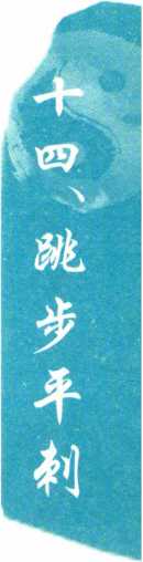 3.跳步收剑3.跳步收剑右脚蹬地,左脚随即 向前跨跳一步,右脚在左 脚将落地时,迅速向左小 腿内侧收拢。两手分至身 体两侧,手心翻转向下; 左手成剑指。眼看前方。 (图 14一3、图 14-4)