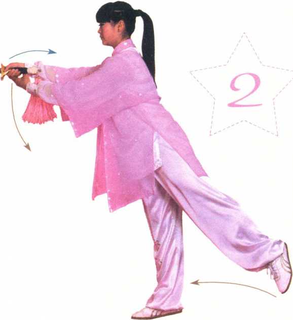 重心前移至右腿,蹬腿送髓,左脚离地。两手捧剑向前伸刺。眼看前 方。(图 14-2)