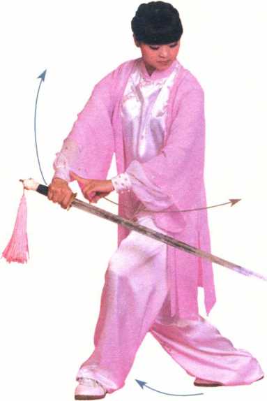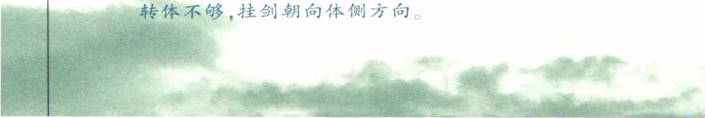 挂剑是用剑尖由前向后勾开对方。做本动时,右臂屈腕挥臂, 使剑尖向下,虎口向后,剑尖领先,剑贴近身体左侧向下、向后挂 摆,运行路线成立圆。