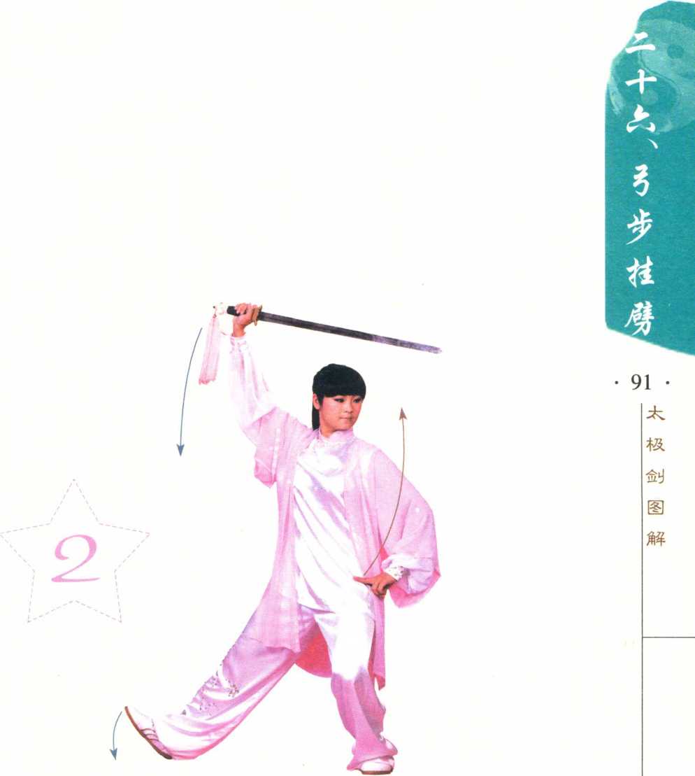 太上体左转,左脚向前横落,两 腿交叉,重心前移,右脚跟离地。 右手持剑经体左侧向后勾挂。左 剑指附于右腕部。眼转看剑尖。上体左转,左脚向前横落,两 腿交叉,重心前移,右脚跟离地。 右手持剑经体左侧向后勾挂。左 剑指附于右腕部。眼转看剑尖。极(图26-1)极(图26-1)剑?90 -剑?90 -