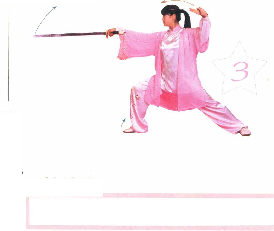 上体左转,左脚向前横落,两 腿交叉,重心前移,右脚跟离地。 右手持剑经体左侧向后勾挂。左 剑指附于右腕部。眼转看剑尖。