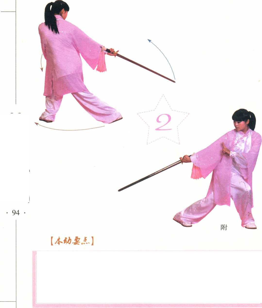 2 .向后抡剑时,右臂内旋,剑把领先,剑贴近身体向后划弧,剑 尖不要触地O直至剑在身后反手抡直,剑尖向后(东)o
