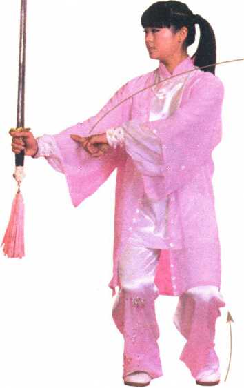 身体向右后转,随之左脚收至右脚内侧,脚尖点地。右手持剑继续 反手抽撩至右后方,然后右臂外旋,右腕下沉,剑尖上挑,剑身斜立于身 体右侧。左手剑指随剑收于右前臂内侧。眼看剑尖。(图2-3、图2-4)