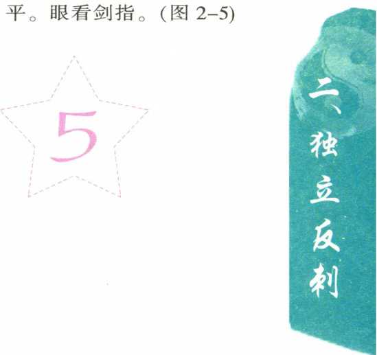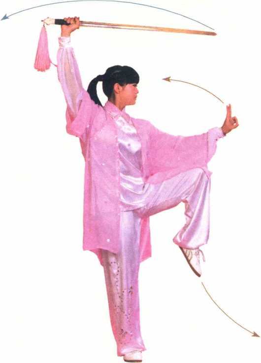 上体左转,左腿屈膝提起 成独立步O右手持剑由后划弧 上举,使剑经头侧上方向前反 手刺出,方向正东,手心向外, 力注剑尖。左手剑指经须下随 转体向前(东)指出,高与鼻