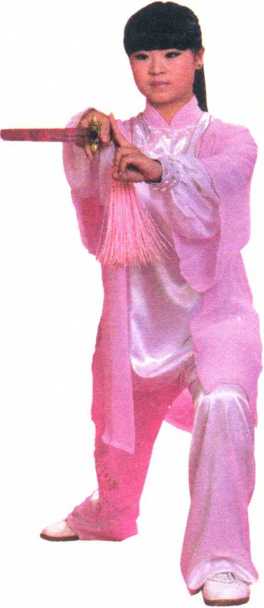 重心前移,上体左转,左腿屈弓成左弓步o右手立剑向前刺出,虎口 向上,高与胸平。左剑指附于右腕部。眼看前方。(图32-3)