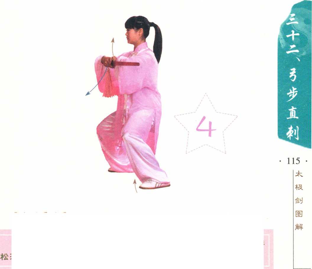 1. 弓步和刺剑不同步,出现先弓步,后刺剑。2. 剑不是经腰间刺 出,而从体侧向前刺 出。1. 弓步和刺剑不同步,出现先弓步,后刺剑。2. 剑不是经腰间刺 出,而从体侧向前刺 出。