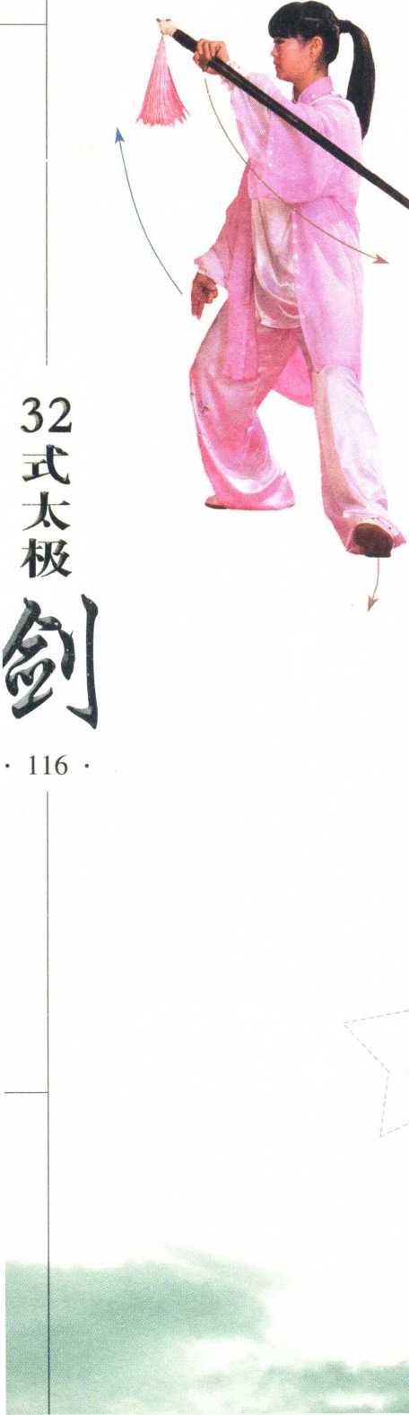 身体左转,重心前移,右脚向 前跟步,与左脚平行成开立步。左 手接剑,经体前垂落于身体左侧。 右手变成剑指向下、向后划弧上 举,再向前、向下落于身体右侧。眼 看前方。(图32-5?图32-8)