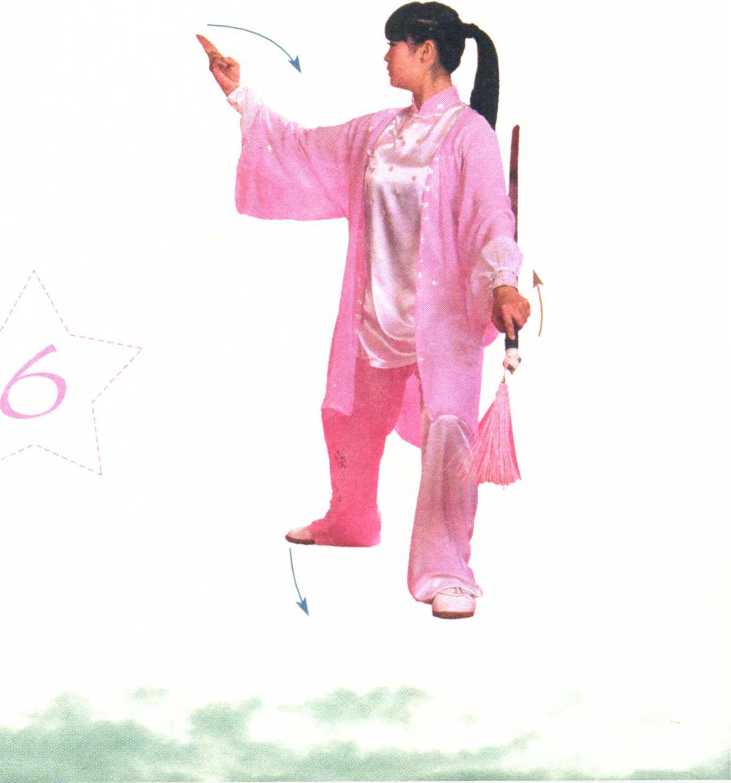 换握剑时,左手持剑下落. 下落与右脚跟步要协调一致。